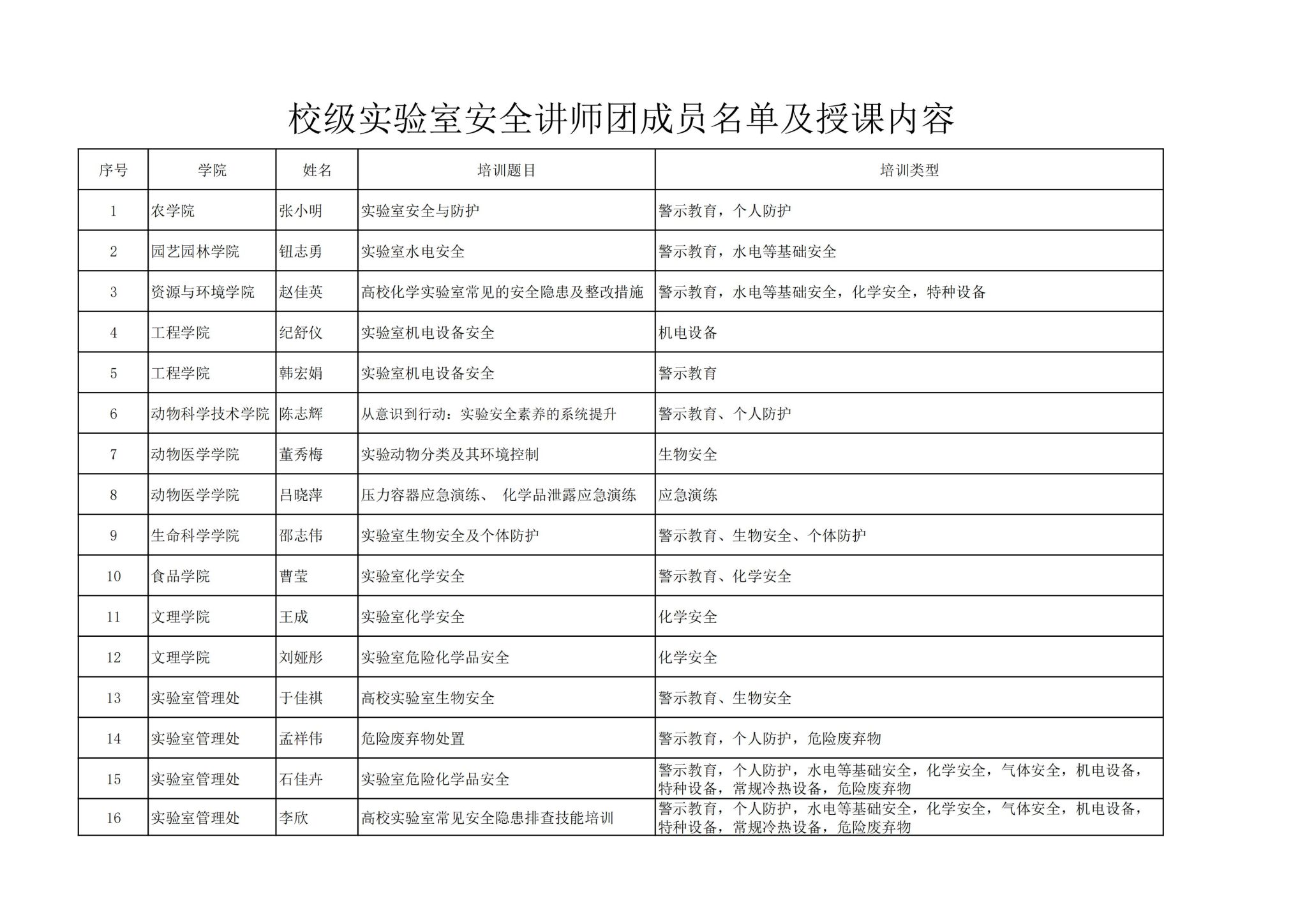 为进一步强化我校实验室安全管理,提升师生实验室安全素养与应急处置能力,筑牢实验室安全防线,学校经个人申报、学院推荐、专家评审及集中培训等环节,组建了东北农业大学校级实验室安全讲师团。现公布讲师团成员名单及授课内容,相关事宜通知如下: